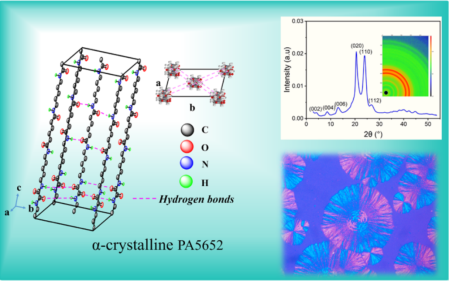 貴大新聞網(wǎng)訊(材料與冶金學(xué)院)近日,我校材料與冶金學(xué)院劉玉飛特聘教授團(tuán)隊(duì)在生物基聚酰胺材料研究領(lǐng)域取得重要突破,相關(guān)成果以 Biobased Polyamide 5652 with α?Crystal Form: Characterization and Low Moisture Absorption為題,發(fā)表于高分子領(lǐng)域頂級(jí)期刊Macromolecules(自然指數(shù)期刊,中科院一區(qū)TOP)。貴州大學(xué)材料與冶金學(xué)院為論文第一完成單位,材料與冶金學(xué)院2022級(jí)碩士研究生王艷平為第一作者,劉玉飛特聘教授為通訊作者。近年來(lái),生物基聚酰胺56(PA56)因其原料可再生、低碳環(huán)保而備受關(guān)注,但其特殊的分子結(jié)構(gòu)(戊二胺單元含奇數(shù)碳原子)導(dǎo)致其晶體通常以γ晶型為主,飽和吸水率高達(dá)12%以上,在潮濕環(huán)境中力學(xué)性能顯著下降(如拉伸強(qiáng)度降低20%-30%),嚴(yán)重限制了在精密工程領(lǐng)域的應(yīng)用,而傳統(tǒng)改性方法往往以犧牲材料其他性能為代價(jià)。針對(duì)這一難題,劉玉飛特聘教授創(chuàng)新性地提出了雙氫鍵結(jié)構(gòu)調(diào)控策略:自主合成關(guān)鍵單體,設(shè)計(jì)并成功合成新型565二胺單體(C16H34N4O2),將565二胺與草酸二丁酯通過(guò)溶液聚合及